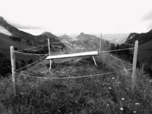 Il m’était déjà arrivé au printemps une histoire un peu comme ça. Rien vu lors d’une randonnée et tout-à-coup, au bout de la montée, alors qu’on a déjà eu envie de redescendre une ou deux fois, d’abandonner, une surprise, un banc de bois vide, cerné de rubans pour que les vaches ne viennent pas le démolir ou le souiller. Un banc au sommet pour méditer, regarder le monde comme le faisait la marmotte ultime, la dernière de l’automne. Un banc chauffé au soleil, qui dissout instantanément l’envie de repartir. Trois fois rien, mais le sentiment de vivre un moment exceptionnel.