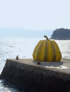 Ce dimanche-là, les cheveux emmêlés par le vent face à une mer agitée, les oreilles remplies du son des vagues qui s’écrasent lourdement contre les rochers surmontés de pins, j’ai contemplé une citrouille jaune poussin constellée de grosses pastilles noires. Au bout d’un ponton d’une simplicité muette, l’emblème de l’île, à la merci des éléments, réalisée par Yayoi Kusama, donnait l’impression d’avoir été déposée là par un Petit Poucet farceur des temps modernes. Un joyau, exposé à la vue de tous dans un environnement unique, comme un cadeau pour celui qui passerait par là. L’espace d’un instant, il régnait une étrange, mais pas désagréable, ambiance de fin du monde sur cette plage vide.