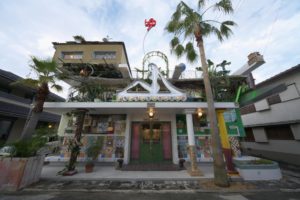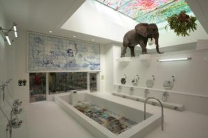 sombres, se sont très vite dispersés à peine après avoir accostés. Certains sont allés directement louer des vélos électriques et d’autres ont préféré le service des bus aux départs réguliers qui mènent de l’autre côté de l’île. Pour ma part, c’est à pied que j’ai souhaité parcourir les chemins goudronnés qui serpentent les environs. Là, il est possible d’emprunter des routes selon son intuition, se laisser porter, se perdre dans ses pensées et soudain, à l’angle d’une ruelle, tomber nez à nez avec les bains publics conçus par Shinro Ohtake où la contemplation de la façade, constituée d’un collage massif d’objets hétéroclites et de catelles aux motifs colorés, est une invitation tacite. A l’intérieur, villageois et visiteurs barbotent ensemble dans un espace carrelé blanc et bleu marine sous le regard bienveillant d’une statue d’éléphant. Le concept de glisser du beau dans le quotidien, sans aucune ostentation, prend ici tout son sens.