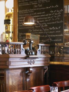 Le matin tôt : L’heure idéale pour un petit noir sur le zinc pour humer l’atmosphère de la ville. Entre les cliquetis des cuillères contre les dessous de tasse blanches, le bruit caractéristique du froissement d’un journal qui se déplie et le va-et-vient incessant des garçons de café, la taille serrée par un tablier noir, les conversations vont bon train. Il suffit d’ailleurs de tendre l’oreille pour saisir, à la volée, quelques indices à propos du contenu des bavardages des voisins. Dans un débit rapide, ça discute sec : expositions en cours, dernier restaurant à tester sans attendre, cinéma d’auteur mais aussi, soucis domestiques. Ainsi, même derrière les luxueuses façades haussmanniennes, les robinets peuvent fuir et les ascenseurs tomber régulièrement en panne, sans que cela alerte outre mesure les propriétaires très désinvoltes vis-à-vis de la question.